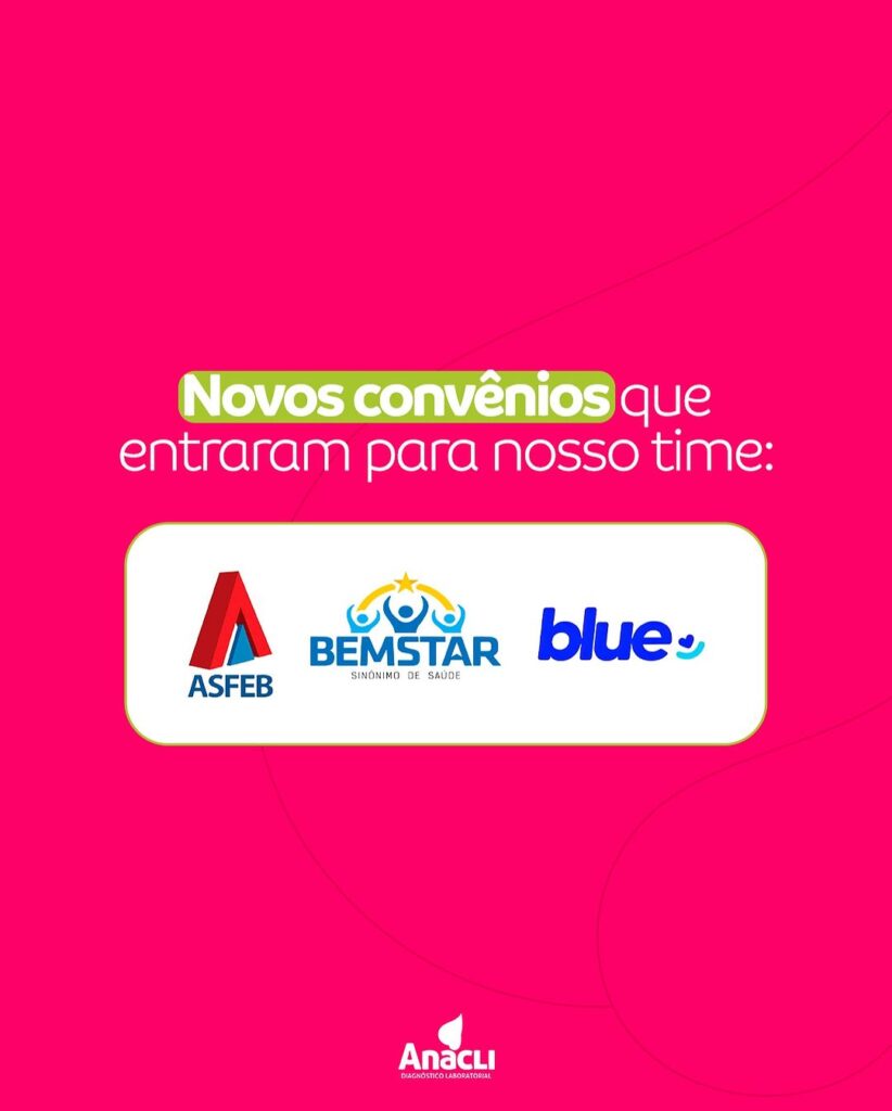 O Laboratório Anácli tem o prazer de anunciar novas parcerias com convênios para oferecer ainda mais acesso e praticidade aos nossos pacientes! Agora, contamos com a cobertura dos planos ASFEB, BEMSTAR e Blue, ampliando nossa rede de atendimento para melhor atender você e sua família.